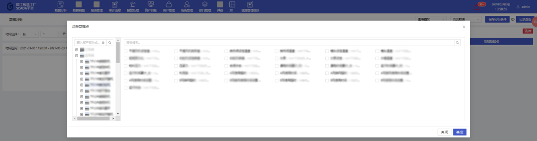 以某一特定設(shè)備為例,使用平臺數(shù)據(jù)分析功能,將平臺中的有效數(shù)據(jù)進(jìn)行分析。根據(jù)用戶的需要,對一段時間內(nèi)的歷史數(shù)據(jù)或?qū)崟r數(shù)據(jù)按照一定的統(tǒng)計頻率進(jìn)行多個維度的數(shù)據(jù)分析,統(tǒng)計頻率包含不限、10秒、30秒、5分鐘、10分鐘、30分鐘、1小時,通過添加變量操作,在彈出的變量選擇彈窗中可多選數(shù)據(jù)點(diǎn)信息,可以通過資產(chǎn)樹選中資產(chǎn)來選擇數(shù)據(jù)信息或者直接通過模糊搜索查找數(shù)據(jù)點(diǎn)。數(shù)據(jù)分析得到的圖表顯示形式包括折線圖以及表格形式。多個數(shù)據(jù)點(diǎn)信息圖表的展示形式包括平鋪、疊加、標(biāo)簽顯示以及合并表格顯示,根據(jù)不同的需求選擇對應(yīng)的展示形式,靈活性高。數(shù)據(jù)分析幫助用戶分析用戶想要分析的內(nèi)容,如數(shù)據(jù)走向、問題等,從而幫助用戶解決問題。