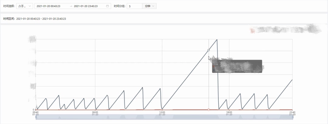 這是現(xiàn)場某一設(shè)備的濾網(wǎng)使用時間分析,按照正常的生產(chǎn)流程,要求單個濾網(wǎng)的使用周期不得超過60分鐘。從上圖的分析中我們可以看出,在早上6點(diǎn)鐘之前,濾網(wǎng)的更換較為頻繁,基本都在60分鐘以內(nèi)。但在6點(diǎn)之后,濾網(wǎng)的更換周期基本在80~90分鐘,其中更是有一次使用時間達(dá)到了300分鐘,這就屬于嚴(yán)重超時,肯定會對產(chǎn)品質(zhì)量產(chǎn)生影響,同時也可能會對設(shè)備產(chǎn)生磨損。