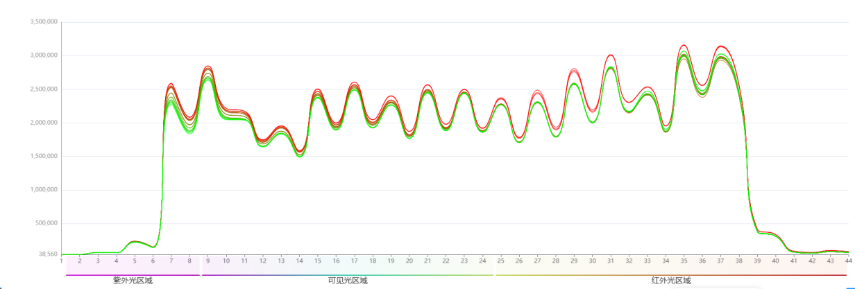 吸收強度圖譜,橫軸為波長通道,縱軸為當前物料各波長通道的光吸收強度。