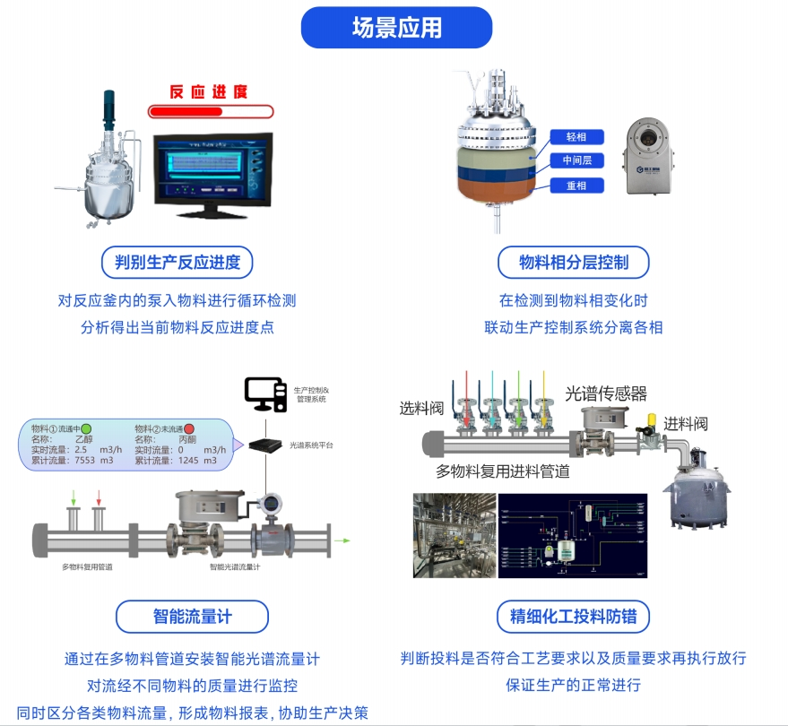通用型在線光譜儀專門為化工場景所研發(fā),采用本安型防爆傳感器,多光源、大光程,抗干擾能力強(qiáng),能夠快速的檢測分析得出結(jié)果,保證生產(chǎn)現(xiàn)場管理時(shí)效性。采用夾持的方式安裝在管道視鏡上,安裝調(diào)試方便,采樣覆蓋紫外-可視光-紅外全頻段。無需更換傳感器來調(diào)整頻段,可與產(chǎn)線生產(chǎn)控制系統(tǒng)如DCS進(jìn)行聯(lián)動和數(shù)據(jù)傳輸,同時(shí)整套系統(tǒng)接入國工智能MAI系統(tǒng),對產(chǎn)線產(chǎn)品生產(chǎn)進(jìn)行實(shí)時(shí)監(jiān)控和決策分析.
