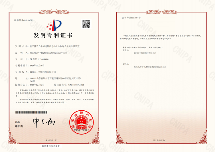近日,國工智能新添國家知識產(chǎn)權(quán)局頒發(fā)的一項發(fā)明專利證書“基于量子力學描述符信息的化合物逆合成方法及裝置”。